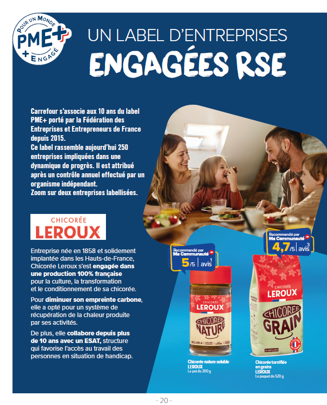 À l'occasion de cet anniversaire, Carrefour a choisi de faire un focus sur deux entreprises spécifiquement labellisées PME+, Chicorée Leroux et Sabarot, pour illustrer les diverses initiatives des PME-ETI de cette communauté, telles que :