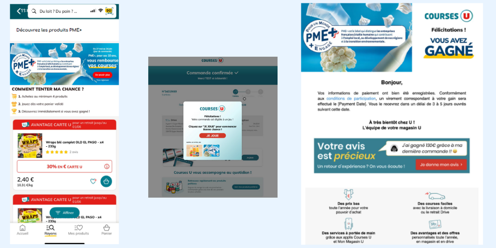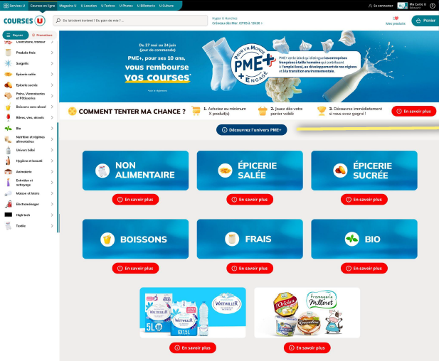 De la page d'accueil sur le site/l'application CoursesU, en passant par la page "Rayons" et la page "Promotions", des bannières dédiées mettront en avant le label PME+. Ces bannières sont de véritables portes d'entrée, guidant les consommateurs vers une boutique dédiée aux produits des entreprises labellisées PME+.