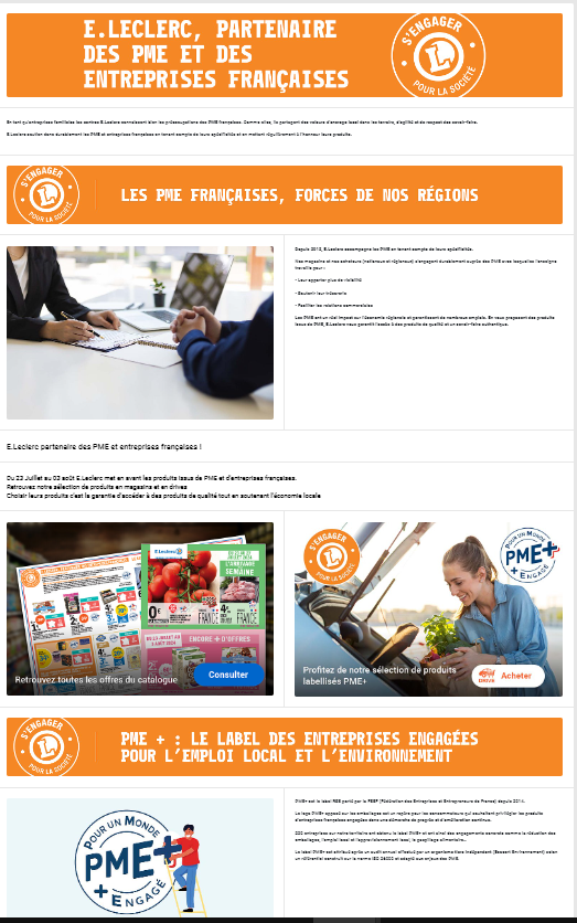 Un dispositif complet à découvrir : des prospectus avec des pages spéciales, une page web dédiée sur le site de l'enseigne, une visibilité du logo PME+ sur le drive, l'activation d'une boutique PME+ et la diffusion d'un film pour promouvoir l'opération sur les écrans in store !