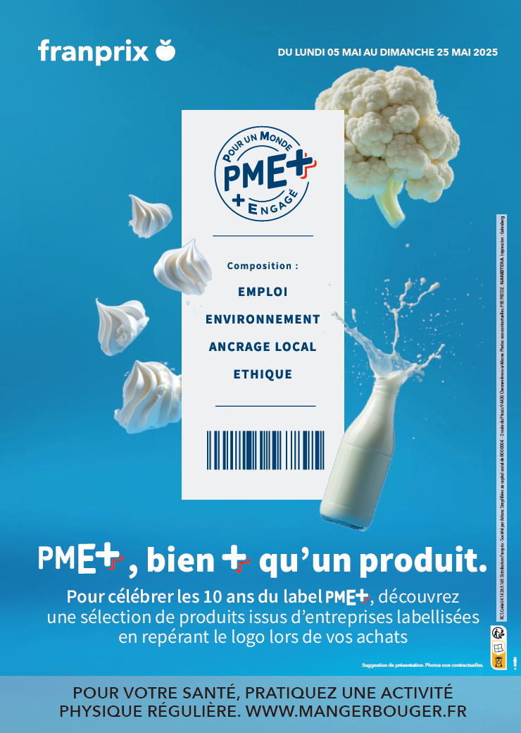 Du 5 au 25 mai 2025, Franprix met à l’honneur le label PME+ et les produits des entreprises labellisées PME+ avec un dispositif promotionnel omnicanal concernant 83 références.