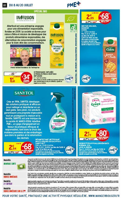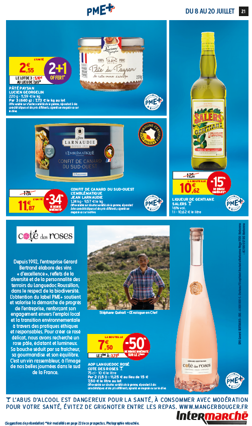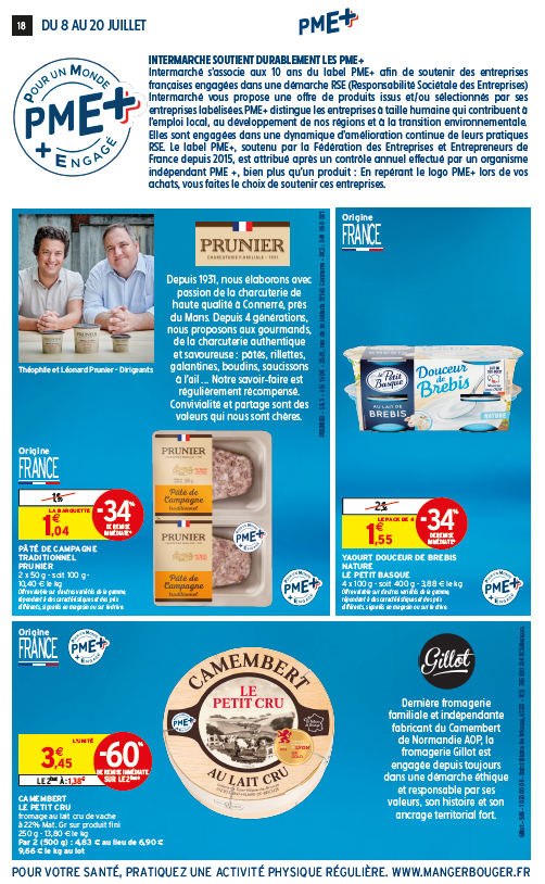 Ce prospectus met en avant une diversité de produits de marques labellisées PME+ tels que le pâté de campagne Maison Prunier, les yaourts au lait de brebis Le Petit Basque, le camembert Le petit cru Gillot, les œufs de L’Œuf de nos Villages, les céréales Funkie, la chicorée soluble Chicorée Leroux, la pâte à tartiner Lucien Georgelin, les biscuits roses Fossier, les chouchous Daco Bello, les pâtes collection 1844 Alpina Savoie, le pâté paysan Lucien Georgelin, le confit de canard du Sud-Ouest Jean Larnaudie, la liqueur de gentiane Salers Vedrenne, le vin rosé AOP Languedoc Gérard Bertrand, la citronnade infusée bio Infusion, le nectar orange mangue Cidou, le désinfectant nettoyant Sanytol et les serviettes hypoallergéniques Love & Green.